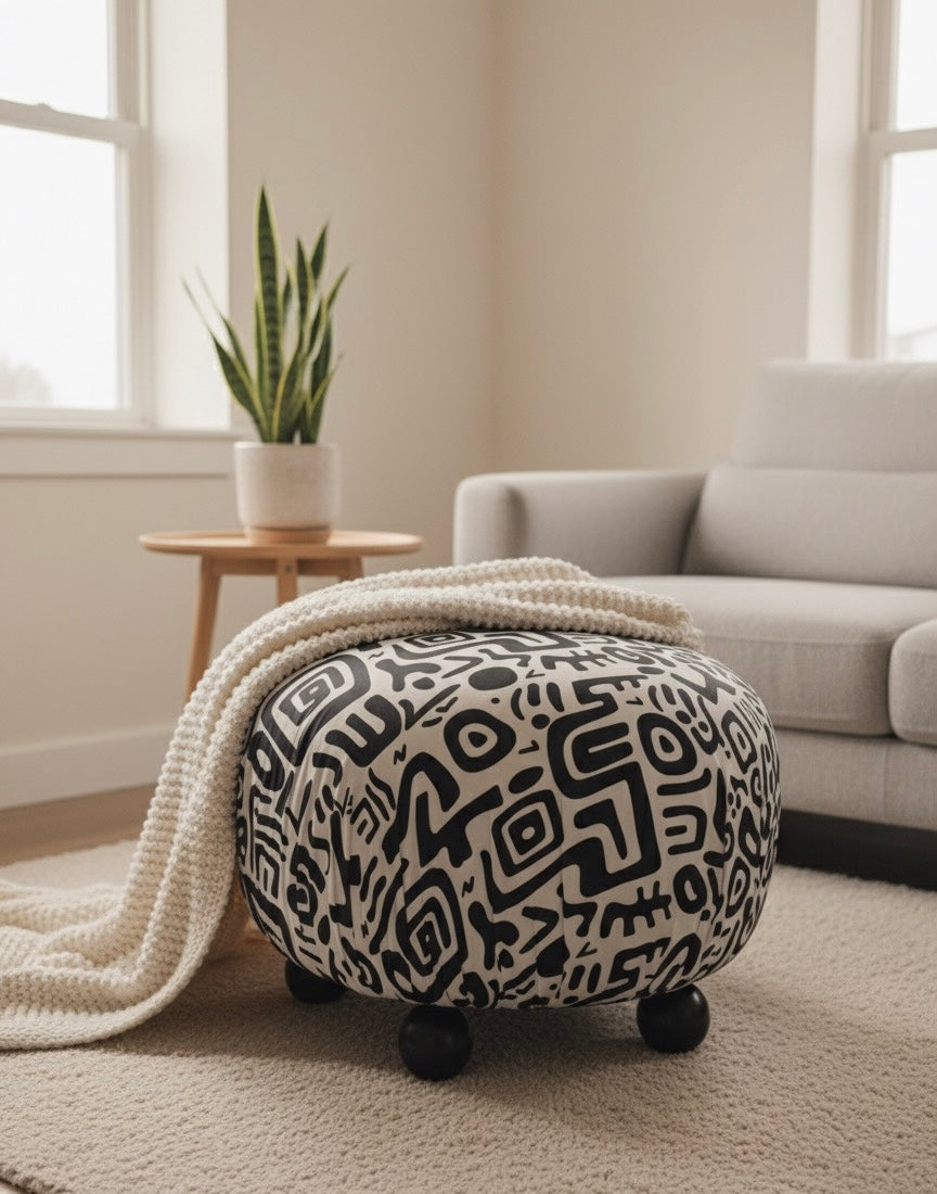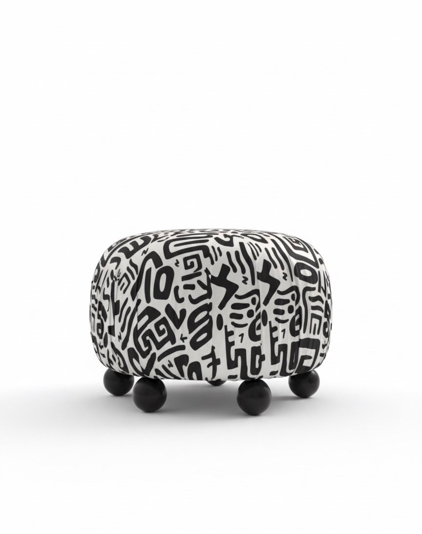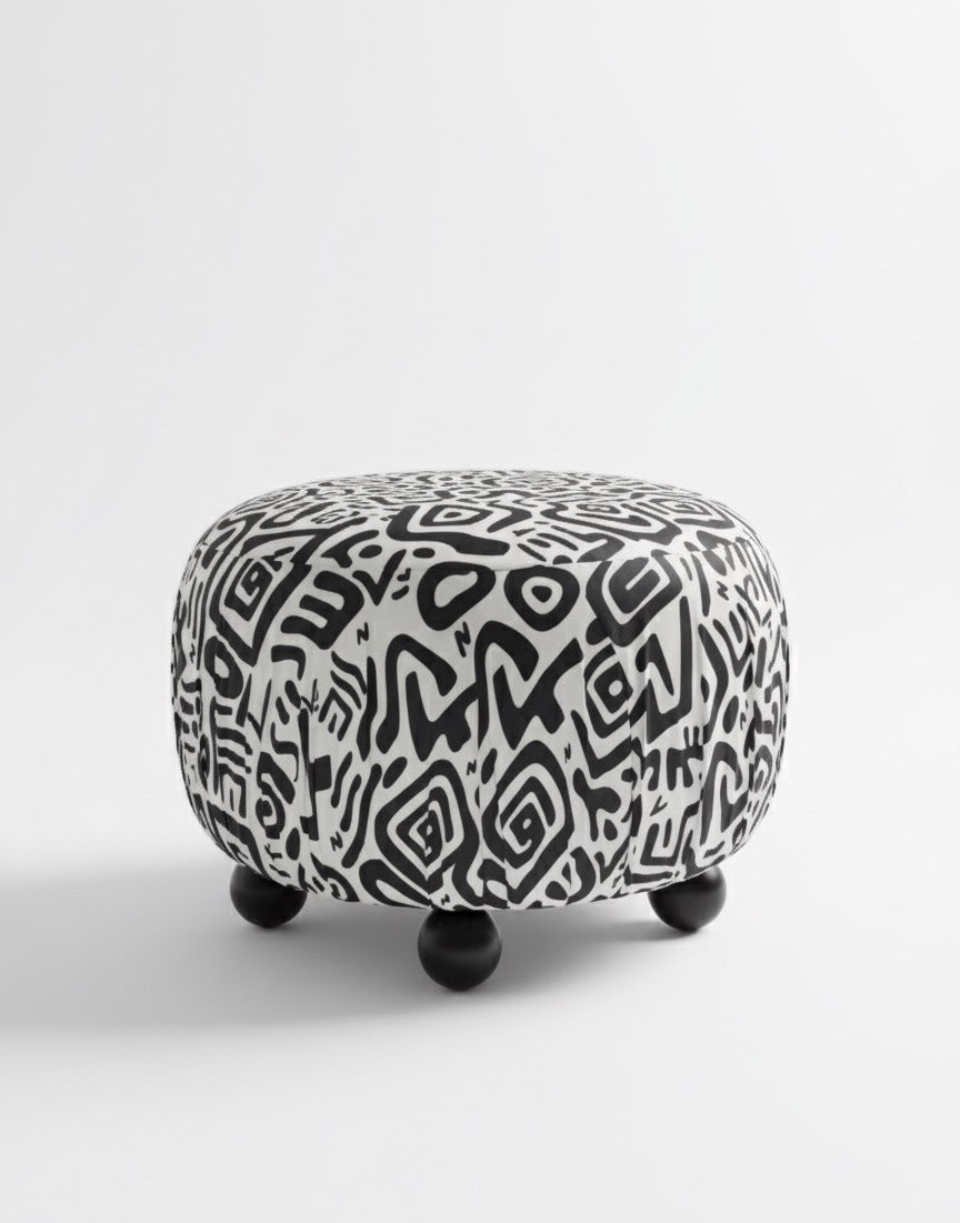 Shaped like a soft sculptural pebble, this pouf is wrapped in bold black-and-white strokes that feel hand-drawn and alive, like a gallery piece you can actually sink into.